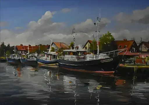 Łeba ulica Abrahama – kutry w porcie. Obraz malowany na płótnie farbą akrylową